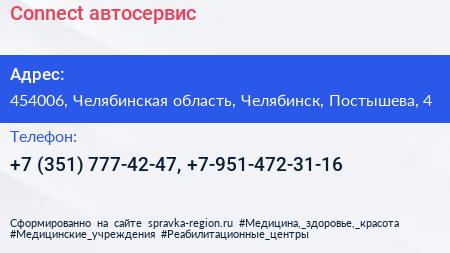 Connect, автосервис по адресу 454006, Челябинская область, Челябинск, Постышева, 4 в дальнейшем Организация, размещена в следующих категориях: