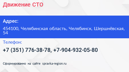 Движение, СТО по адресу 454100, Челябинская область, Челябинск, Шершнёвская, 54 в дальнейшем Организация, размещена в следующих категориях: