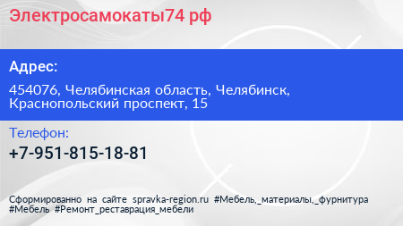 Электросамокаты74.рф по адресу 454076, Челябинская область, Челябинск, Краснопольский проспект, 15 в дальнейшем Организация, размещена в следующих категориях: