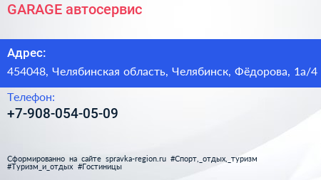 GARAGE, автосервис по адресу 454048, Челябинская область, Челябинск, Фёдорова, 1а/4 в дальнейшем Организация, размещена в следующих категориях: