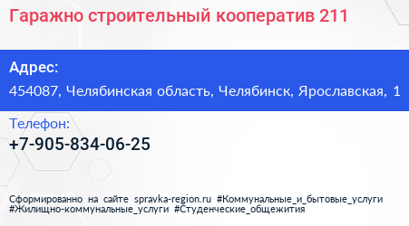Гаражно-строительный кооператив №211 по адресу 454087, Челябинская область, Челябинск, Ярославская, 1 в дальнейшем Организация, размещена в следующих категориях: