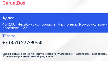 GarantBox по адресу 454100, Челябинская область, Челябинск, Комсомольский проспект, 122 в дальнейшем Организация, размещена в следующих категориях: