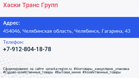 Хаски Транс Групп по адресу 454046, Челябинская область, Челябинск, Гагарина, 43 в дальнейшем Организация, размещена в следующих категориях: