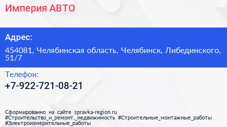 Империя АВТО по адресу 454081, Челябинская область, Челябинск, Либединского, 51/7 в дальнейшем Организация, размещена в следующих категориях: