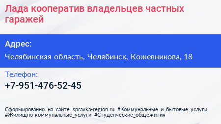 Лада, кооператив владельцев частных гаражей по адресу Челябинская область, Челябинск, Кожевникова, 18 в дальнейшем Организация, размещена в следующих категориях: