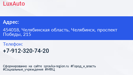 LuxAuto по адресу 454018, Челябинская область, Челябинск, проспект Победы, 215 в дальнейшем Организация, размещена в следующих категориях:
