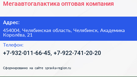 Мегаавтогалактика, оптовая компания по адресу 454004, Челябинская область, Челябинск, Академика Королёва, 21 в дальнейшем Организация, размещена в следующих категориях: