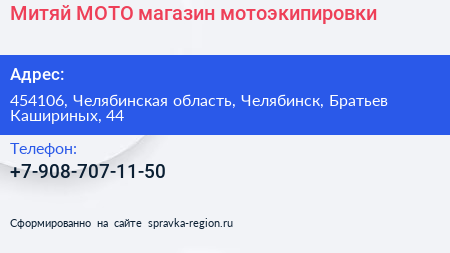 Митяй МОТО, магазин мотоэкипировки по адресу 454106, Челябинская область, Челябинск, Братьев Кашириных, 44 в дальнейшем Организация, размещена в следующих категориях: