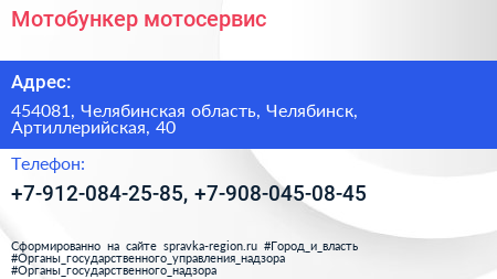 Мотобункер, мотосервис по адресу 454081, Челябинская область, Челябинск, Артиллерийская, 40 в дальнейшем Организация, размещена в следующих категориях: