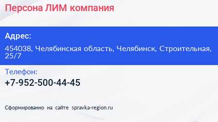 Персона ЛИМ, компания по адресу 454038, Челябинская область, Челябинск, Строительная, 25/7 в дальнейшем Организация, размещена в следующих категориях: