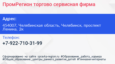 ПромРегион, торгово-сервисная фирма по адресу 454007, Челябинская область, Челябинск, проспект Ленина, 2к в дальнейшем Организация, размещена в следующих категориях: