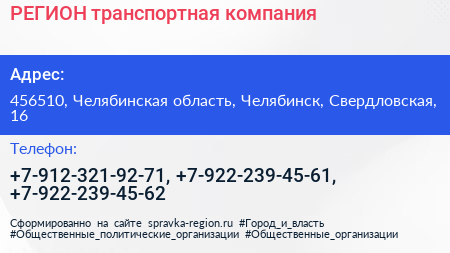 РЕГИОН, транспортная компания по адресу 456510, Челябинская область, Челябинск, Свердловская, 16 в дальнейшем Организация, размещена в следующих категориях: