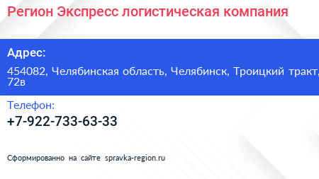 Регион Экспресс, логистическая компания по адресу 454082, Челябинская область, Челябинск, Троицкий тракт, 72в в дальнейшем Организация, размещена в следующих категориях:
