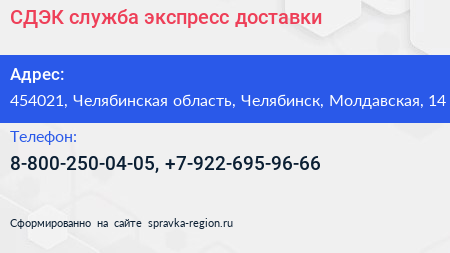 СДЭК, служба экспресс-доставки по адресу 454021, Челябинская область, Челябинск, Молдавская, 14 в дальнейшем Организация, размещена в следующих категориях: