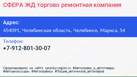 СФЕРА ЖД, торгово-ремонтная компания по адресу 454091, Челябинская область, Челябинск, Маркса, 54 в дальнейшем Организация, размещена в следующих категориях: