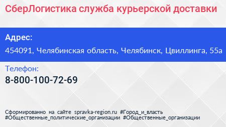 СберЛогистика, служба курьерской доставки по адресу 454091, Челябинская область, Челябинск, Цвиллинга, 55а в дальнейшем Организация, размещена в следующих категориях: