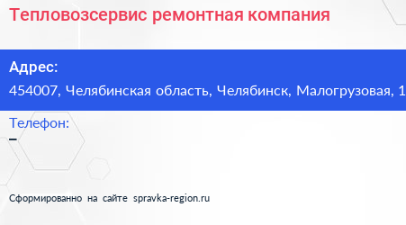Тепловозсервис, ремонтная компания по адресу 454007, Челябинская область, Челябинск, Малогрузовая, 1 в дальнейшем Организация, размещена в следующих категориях:
