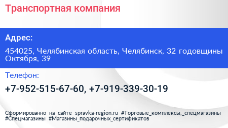 Транспортная компания по адресу 454025, Челябинская область, Челябинск, 32 годовщины Октября, 39 в дальнейшем Организация, размещена в следующих категориях: