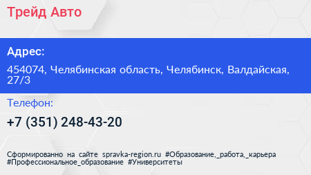 Трейд-Авто по адресу 454074, Челябинская область, Челябинск, Валдайская, 27/3 в дальнейшем Организация, размещена в следующих категориях: