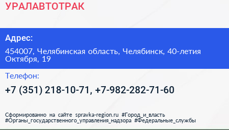УРАЛАВТОТРАК по адресу 454007, Челябинская область, Челябинск, 40-летия Октября, 19 в дальнейшем Организация, размещена в следующих категориях: