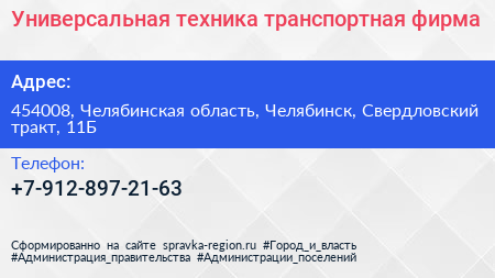Универсальная техника, транспортная фирма по адресу 454008, Челябинская область, Челябинск, Свердловский тракт, 11Б в дальнейшем Организация, размещена в следующих категориях: