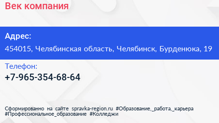 Век, компания по адресу 454015, Челябинская область, Челябинск, Бурденюка, 19 в дальнейшем Организация, размещена в следующих категориях: