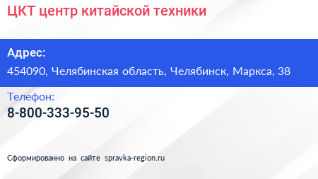 ЦКТ, центр китайской техники по адресу 454090, Челябинская область, Челябинск, Маркса, 38 в дальнейшем Организация, размещена в следующих категориях:
