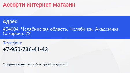 Ассорти, интернет-магазин по адресу 454004, Челябинская область, Челябинск, Академика Сахарова, 22 в дальнейшем Организация, размещена в следующих категориях: