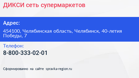 ДИКСИ, сеть супермаркетов по адресу 454100, Челябинская область, Челябинск, 40-летия Победы, 7 в дальнейшем Организация, размещена в следующих категориях: