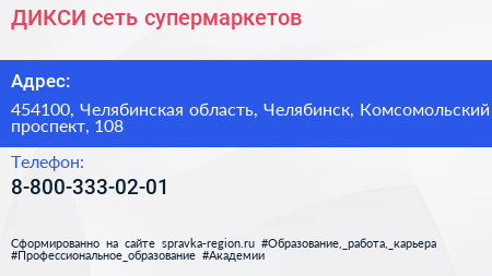 ДИКСИ, сеть супермаркетов по адресу 454100, Челябинская область, Челябинск, Комсомольский проспект, 108 в дальнейшем Организация, размещена в следующих категориях: