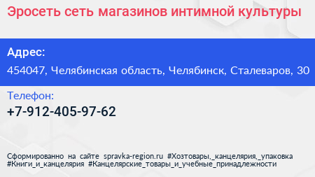 Эросеть, сеть магазинов интимной культуры по адресу 454047, Челябинская область, Челябинск, Сталеваров, 30 в дальнейшем Организация, размещена в следующих категориях:
