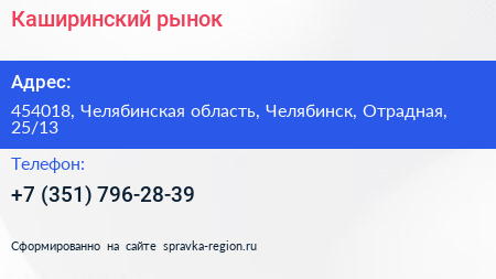 Каширинский, рынок по адресу 454018, Челябинская область, Челябинск, Отрадная, 25/13 в дальнейшем Организация, размещена в следующих категориях: