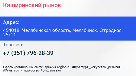Каширинский, рынок по адресу 454018, Челябинская область, Челябинск, Отрадная, 25/11 в дальнейшем Организация, размещена в следующих категориях: