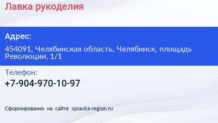 Лавка рукоделия по адресу 454091, Челябинская область, Челябинск, площадь Революции, 1/1 в дальнейшем Организация, размещена в следующих категориях: