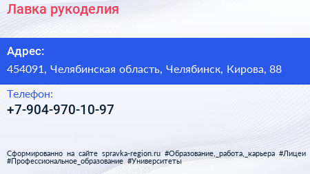 Лавка рукоделия по адресу 454091, Челябинская область, Челябинск, Кирова, 88 в дальнейшем Организация, размещена в следующих категориях: