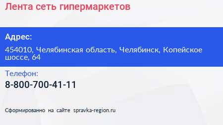 Лента, сеть гипермаркетов по адресу 454010, Челябинская область, Челябинск, Копейское шоссе, 64 в дальнейшем Организация, размещена в следующих категориях: