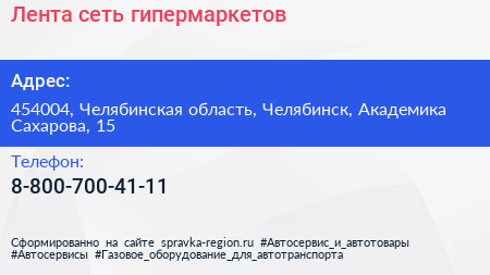Лента, сеть гипермаркетов по адресу 454004, Челябинская область, Челябинск, Академика Сахарова, 15 в дальнейшем Организация, размещена в следующих категориях: