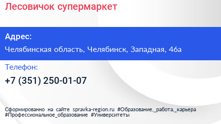 Лесовичок, супермаркет по адресу Челябинская область, Челябинск, Западная, 46а в дальнейшем Организация, размещена в следующих категориях: