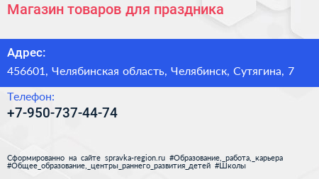 Магазин товаров для праздника по адресу 456601, Челябинская область, Челябинск, Сутягина, 7 в дальнейшем Организация, размещена в следующих категориях: