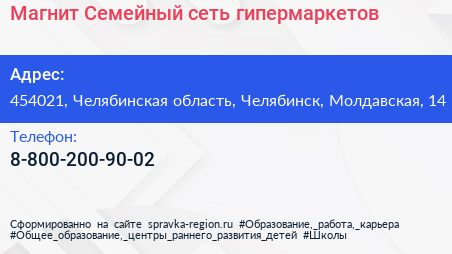 Магнит Семейный, сеть гипермаркетов по адресу 454021, Челябинская область, Челябинск, Молдавская, 14 в дальнейшем Организация, размещена в следующих категориях: