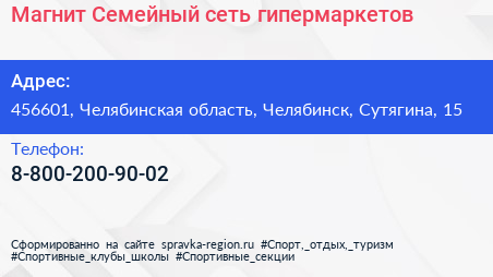 Магнит Семейный, сеть гипермаркетов по адресу 456601, Челябинская область, Челябинск, Сутягина, 15 в дальнейшем Организация, размещена в следующих категориях: