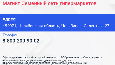 Магнит Семейный, сеть гипермаркетов по адресу 454071, Челябинская область, Челябинск, Салютная, 27 в дальнейшем Организация, размещена в следующих категориях:
