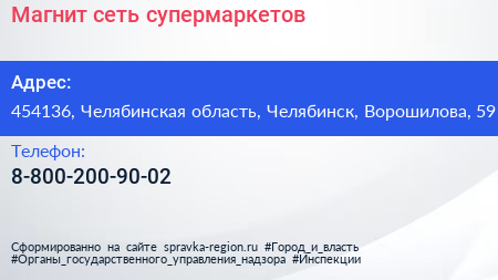 Магнит, сеть супермаркетов по адресу 454136, Челябинская область, Челябинск, Ворошилова, 59 в дальнейшем Организация, размещена в следующих категориях: