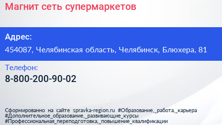 Магнит, сеть супермаркетов по адресу 454087, Челябинская область, Челябинск, Блюхера, 81 в дальнейшем Организация, размещена в следующих категориях: