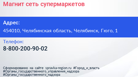 Магнит, сеть супермаркетов по адресу 454010, Челябинская область, Челябинск, Гюго, 1 в дальнейшем Организация, размещена в следующих категориях: