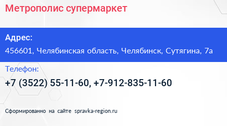 Метрополис, супермаркет по адресу 456601, Челябинская область, Челябинск, Сутягина, 7а в дальнейшем Организация, размещена в следующих категориях: