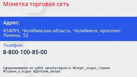 Монетка, торговая сеть по адресу 454091, Челябинская область, Челябинск, проспект Ленина, 52 в дальнейшем Организация, размещена в следующих категориях: