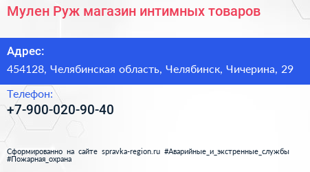 Мулен Руж, магазин интимных товаров по адресу 454128, Челябинская область, Челябинск, Чичерина, 29 в дальнейшем Организация, размещена в следующих категориях: