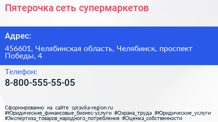 Пятерочка, сеть супермаркетов по адресу 456601, Челябинская область, Челябинск, проспект Победы, 4 в дальнейшем Организация, размещена в следующих категориях: