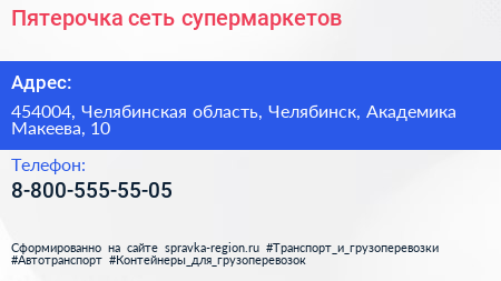 Пятерочка, сеть супермаркетов по адресу 454004, Челябинская область, Челябинск, Академика Макеева, 10 в дальнейшем Организация, размещена в следующих категориях: